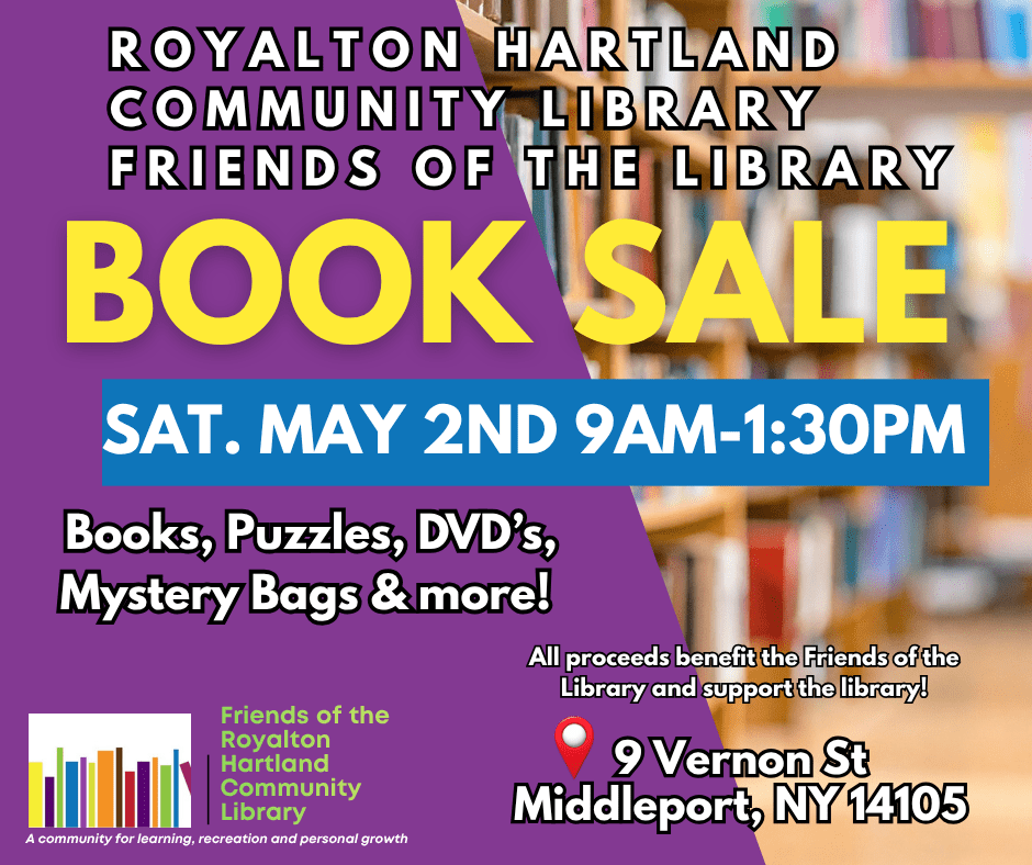 The Friends of the Library SPRING BOOK SALE is coming soon on Saturday, May 2nd from 9am-1:30pm! They will have books, puzzles, DVD’s, mystery bags and more available! All proceeds benefit the Friends of the Library and support the library. Have gently-used donations you would like to donate before the sale? Please hand them to a library staff member at the desk!